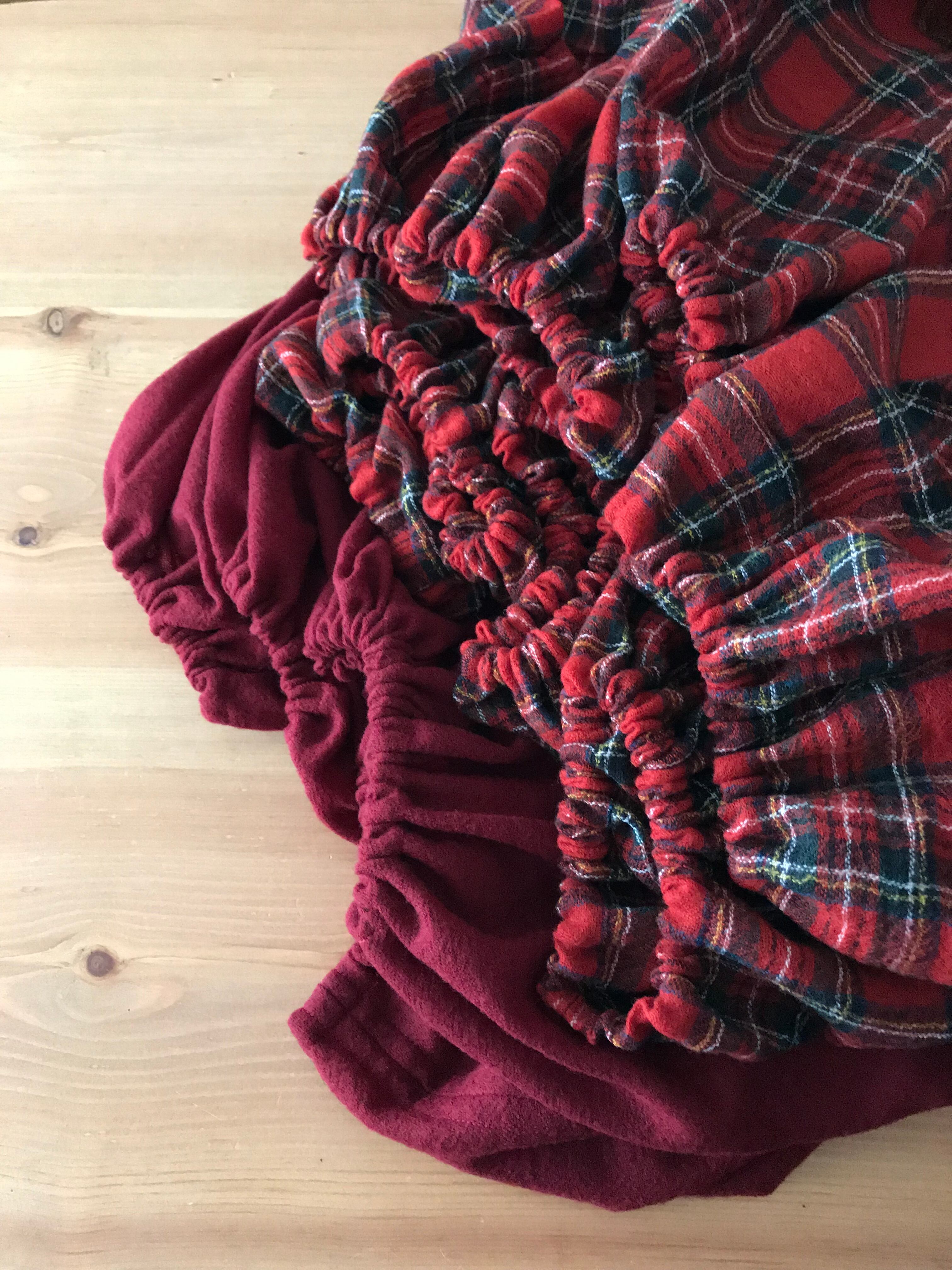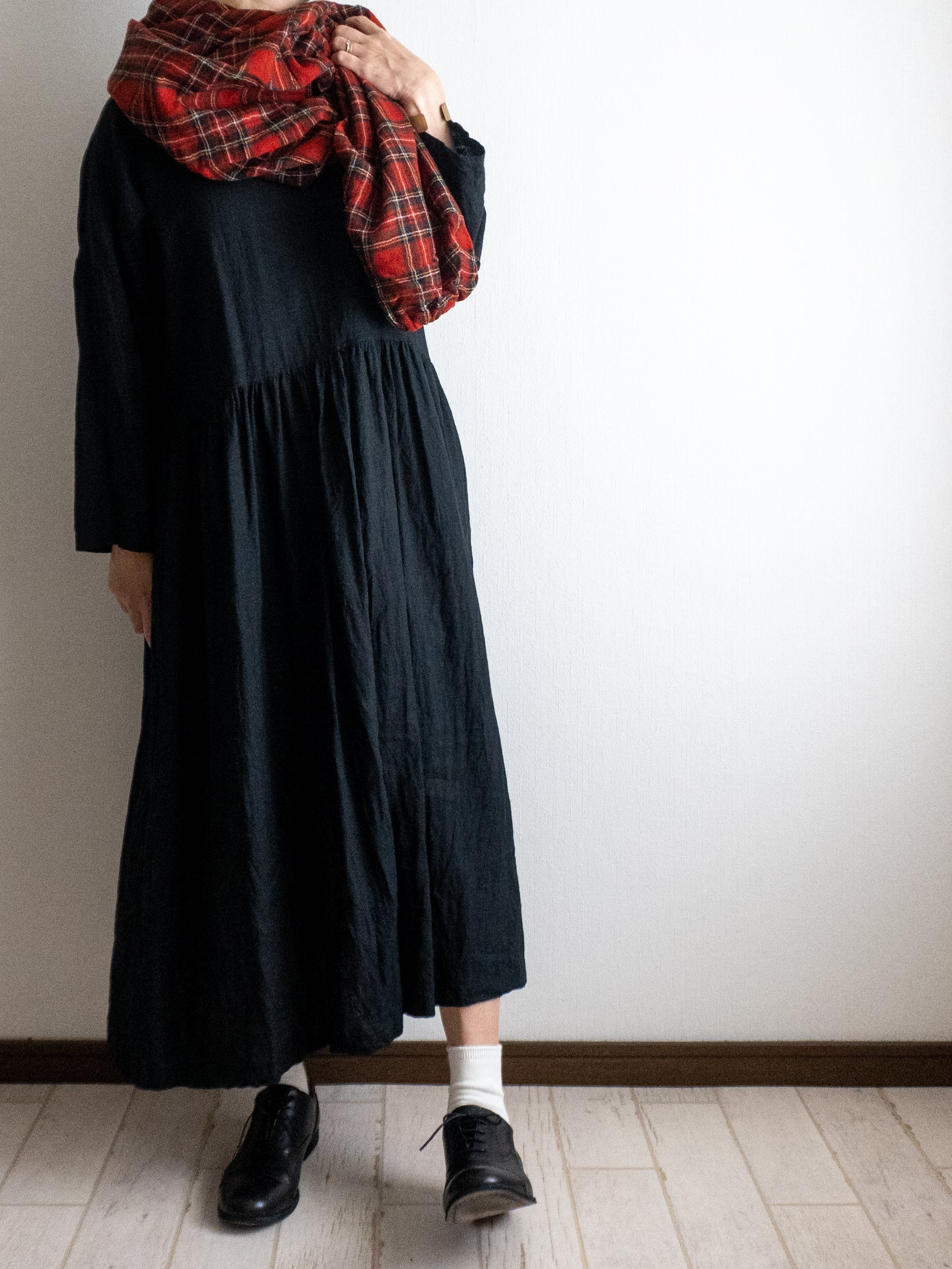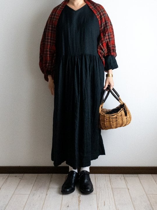 冬にセーターなど厚手のものの上にを着る事も考えて、袖口はゆとりを持ってゴムを入れています。