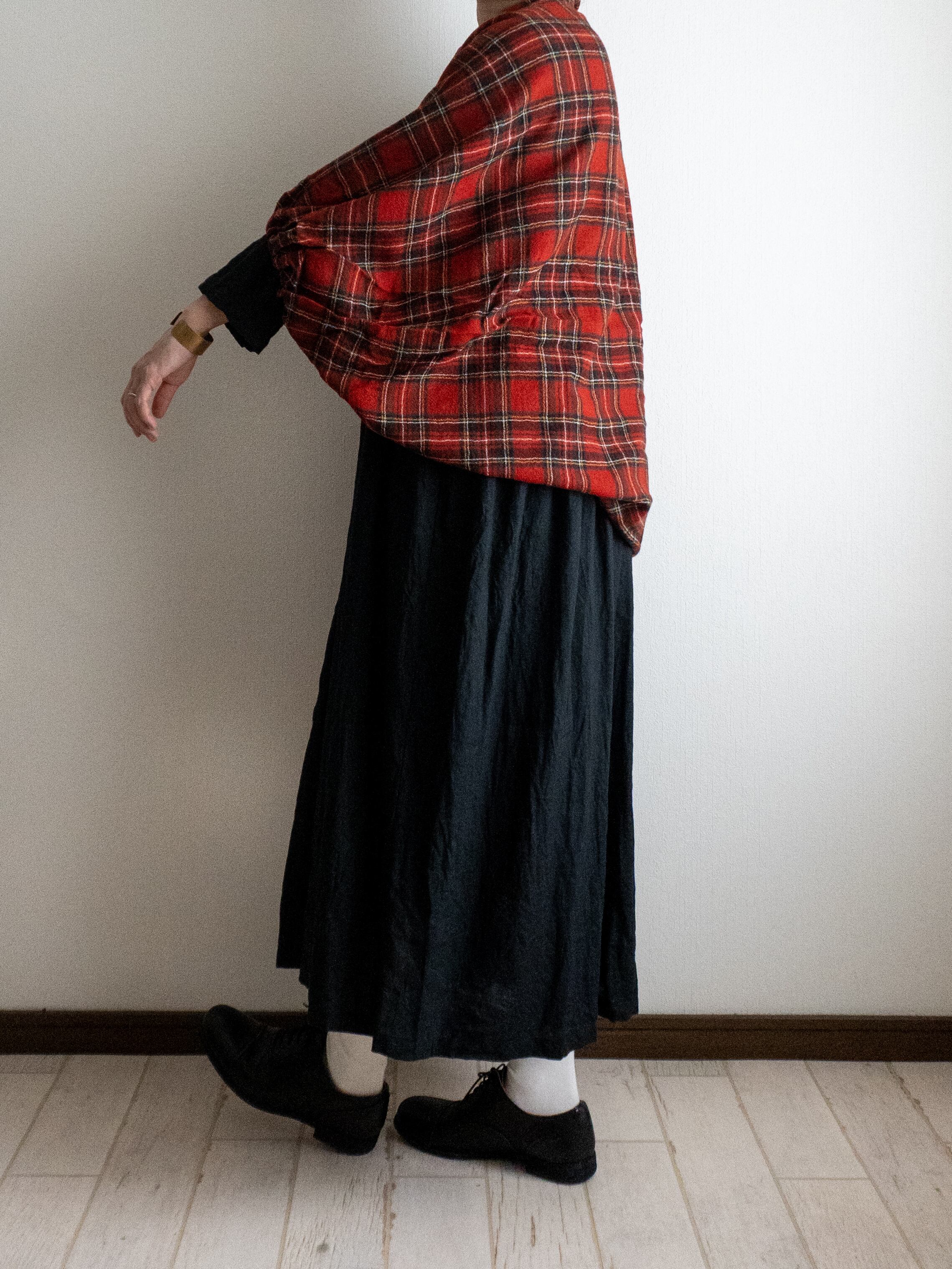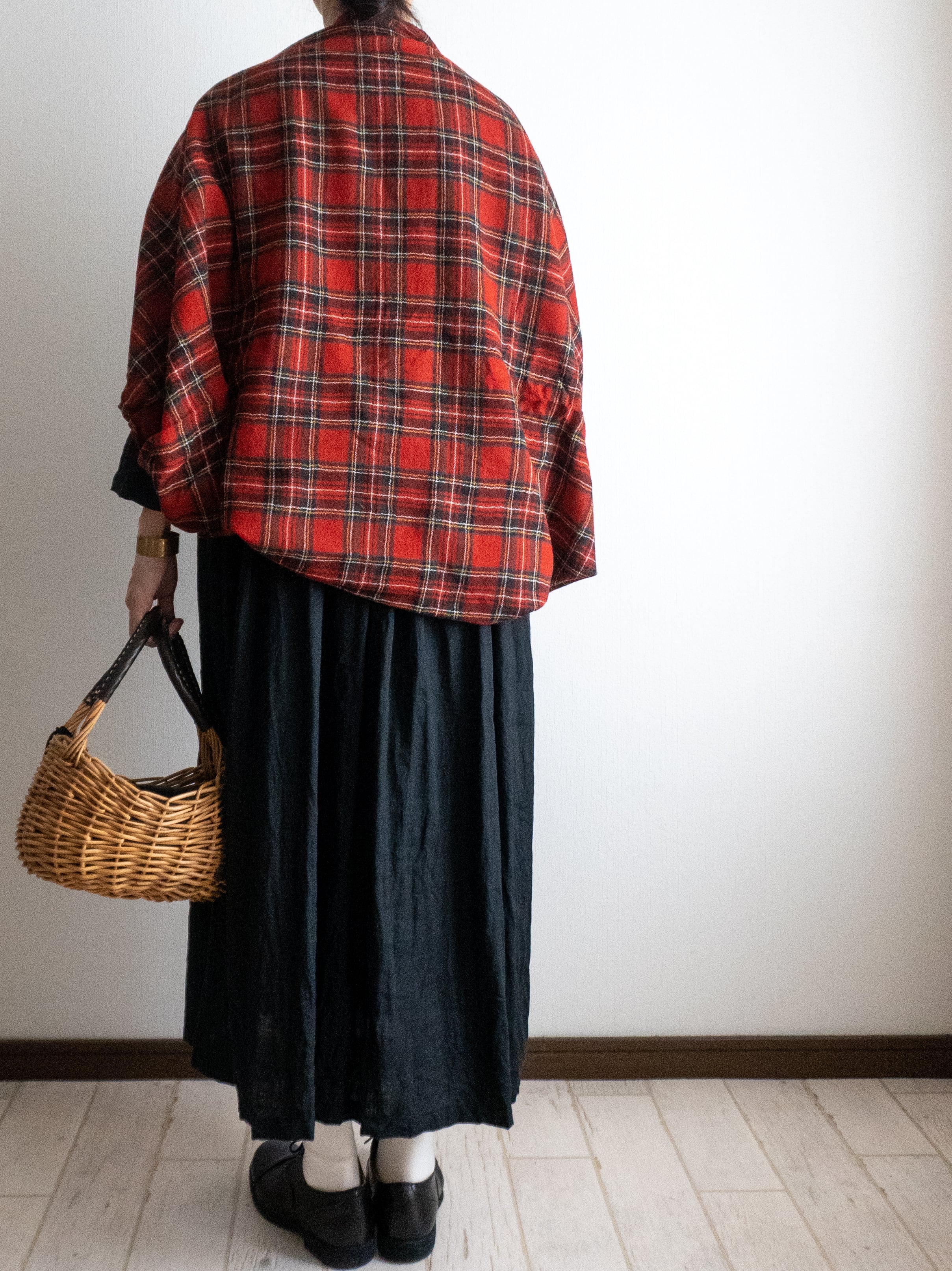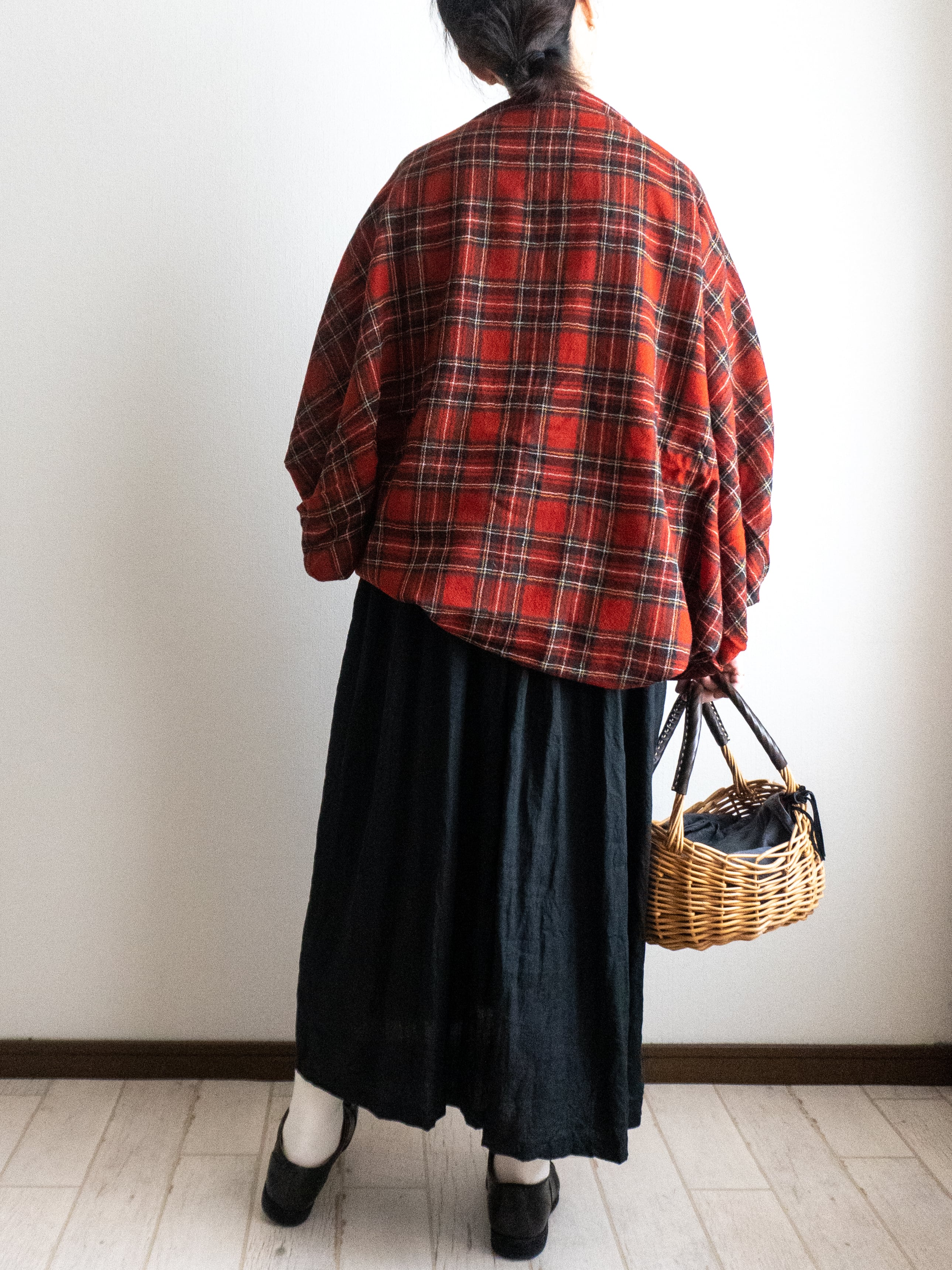 首にかけて、片袖を中央の空いたところからもう片袖の袖口に向かって通すとストール代わりにもなります。ブローチをつけるのもおすすめです。