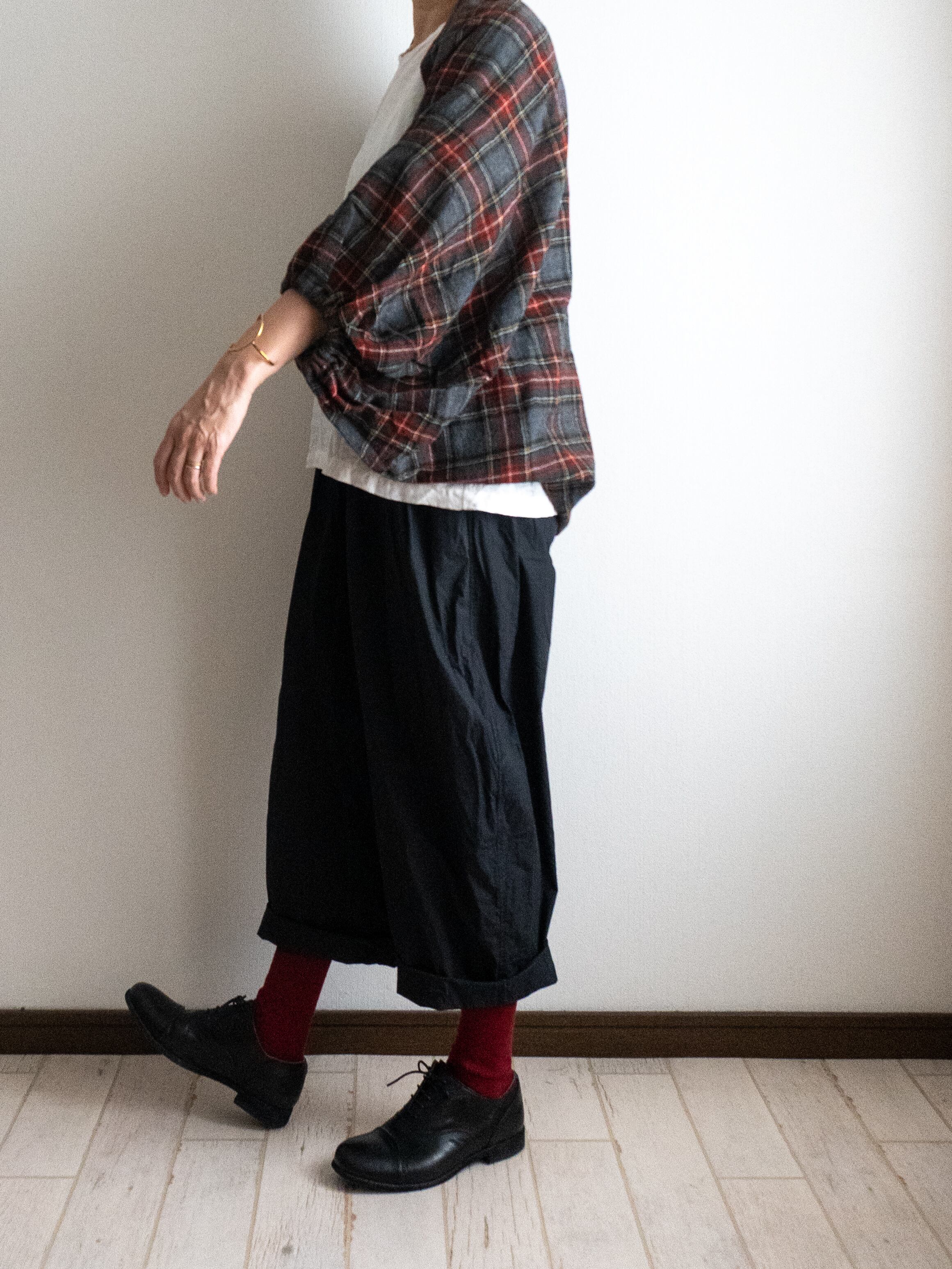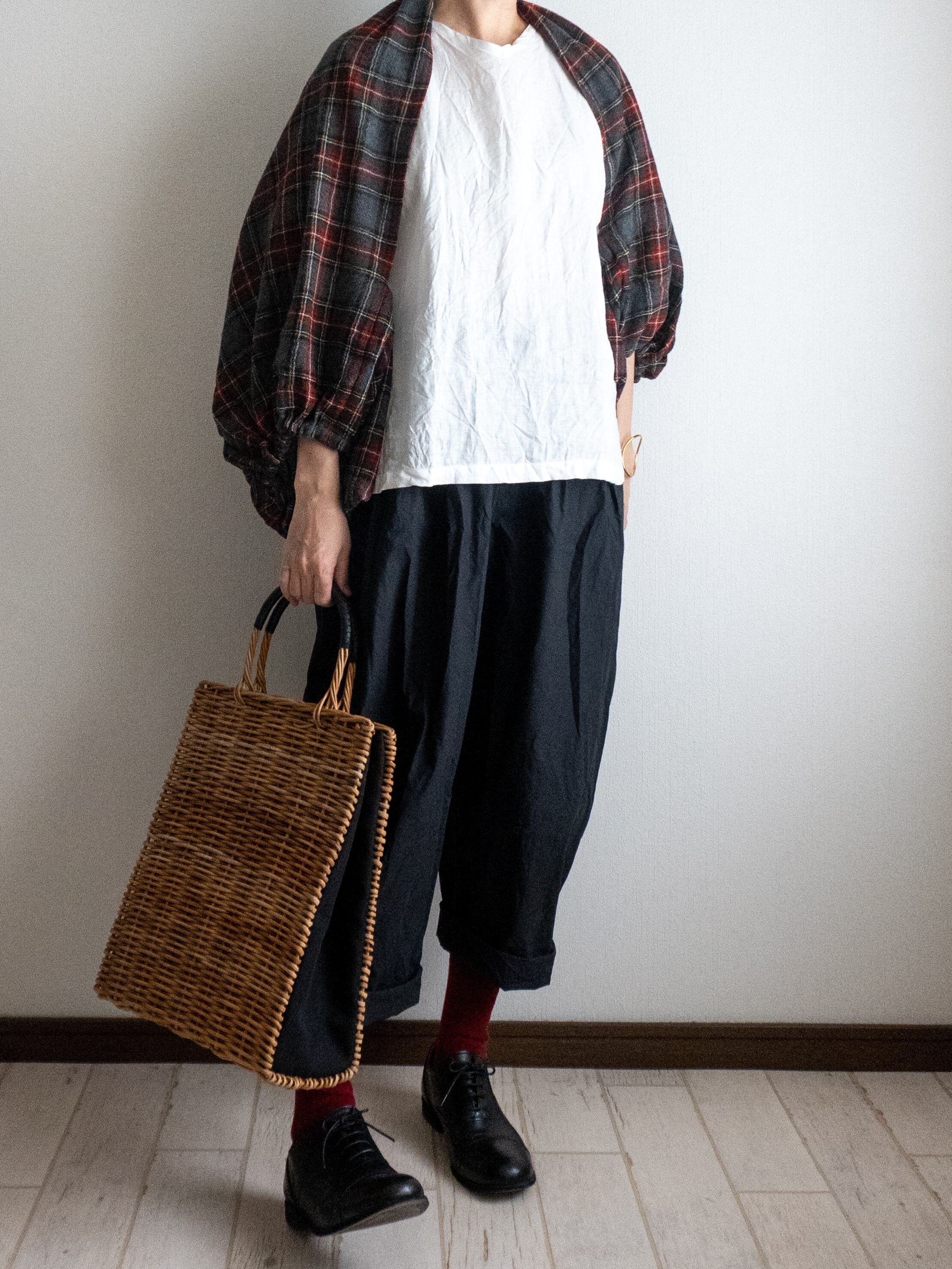 冬にセーターなど厚手のものの上にを着る事も考えて、袖口はゆとりを持ってゴムを入れています。
