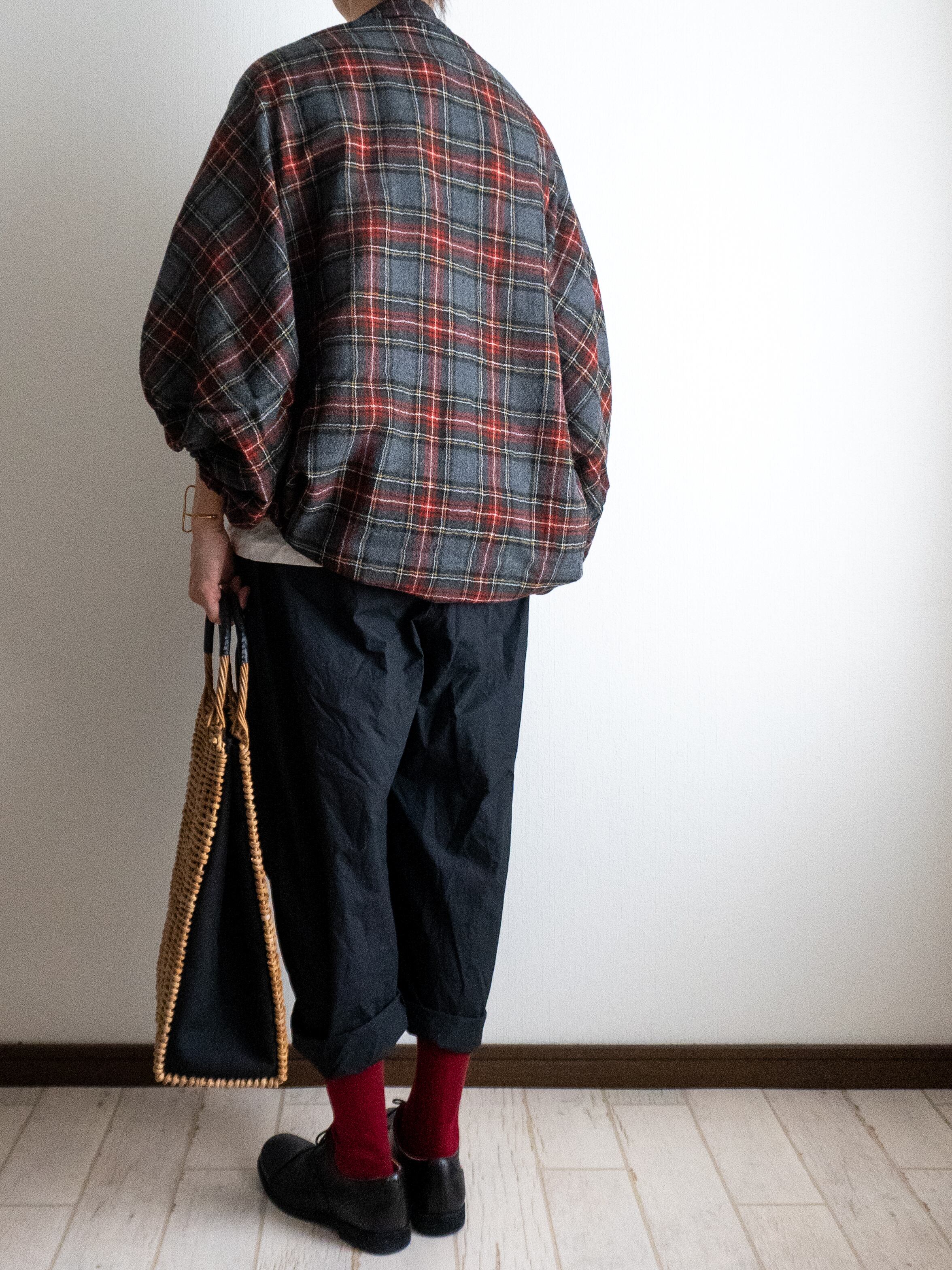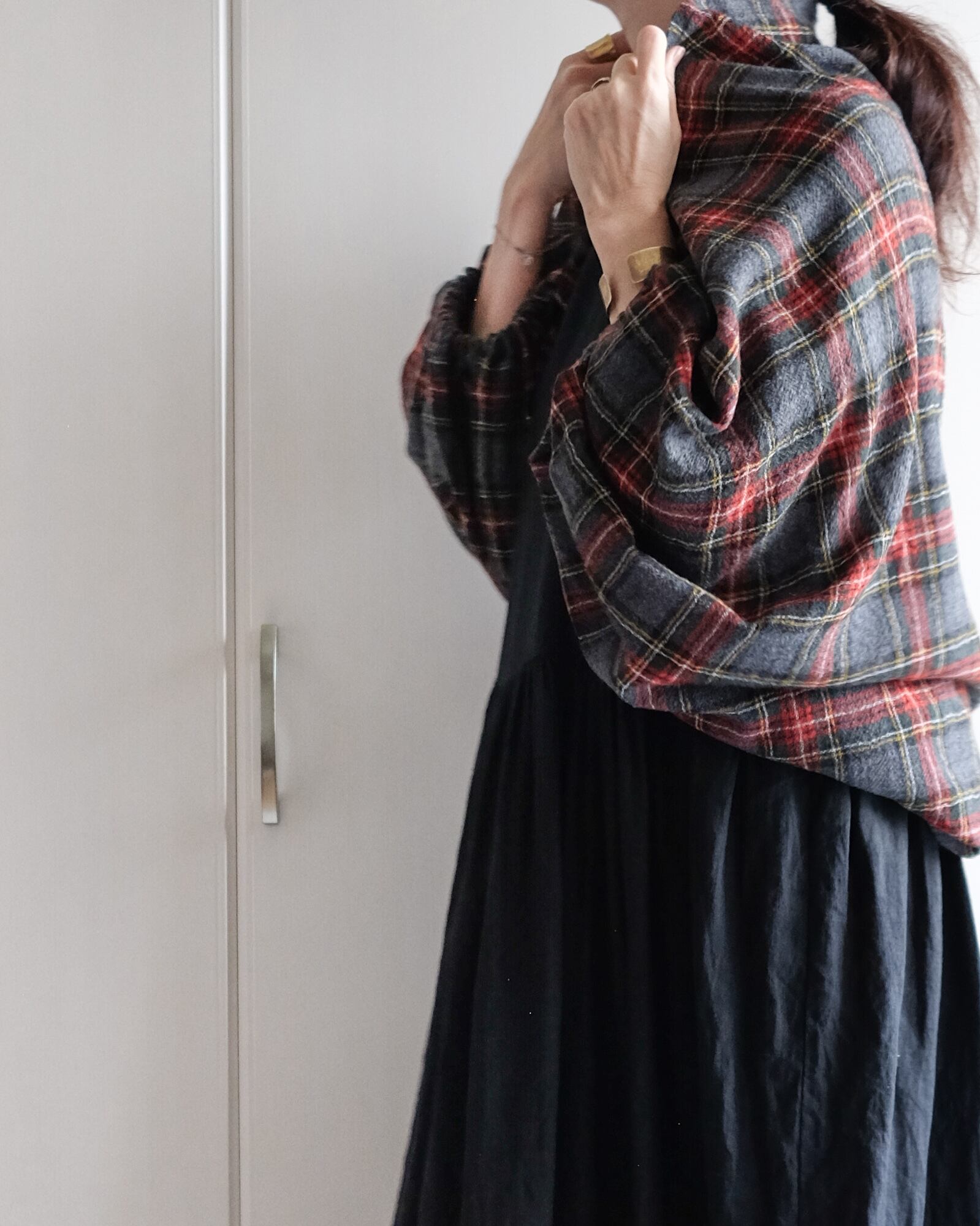 首にかけて、片袖を中央の空いたところからもう片袖の袖口に向かって通すとストール代わりにもなります。ブローチをつけるのもおすすめです。